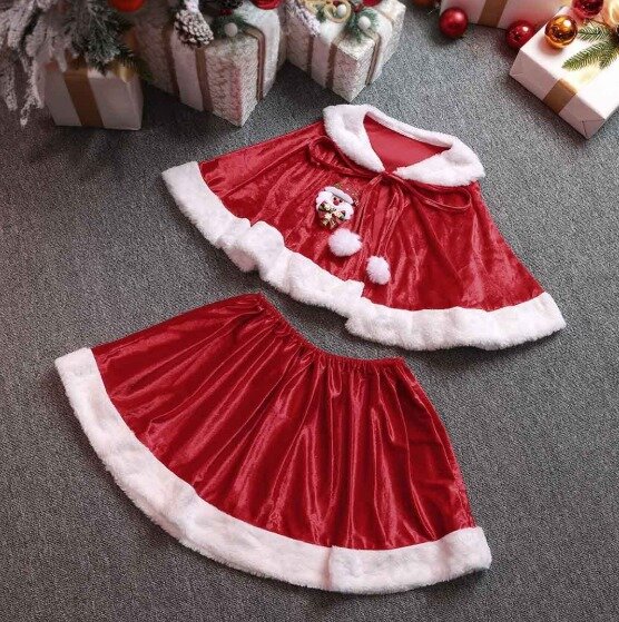 Etek ve pelerin kısmında kullanılan kaliteli kadife kumaş, peluş-tüylü detaylarla birleşerek zengin ve göz alıcı bir görünüm sunar. Fotoğraf çekimleri, sahne gösterileri ve yılbaşı kutlamaları için idealdir.