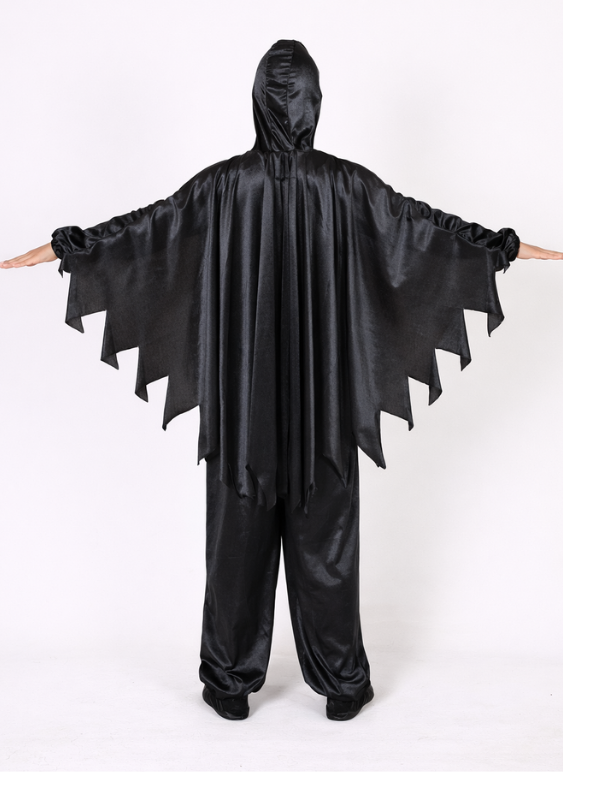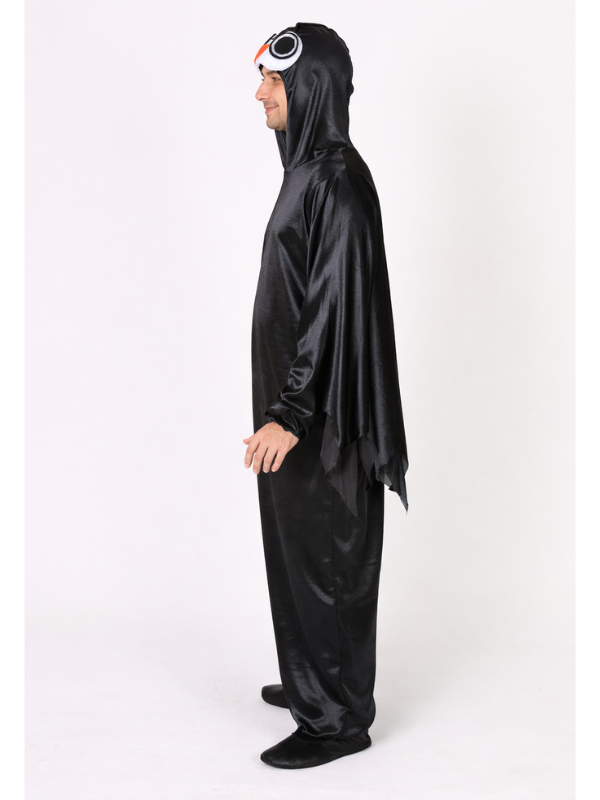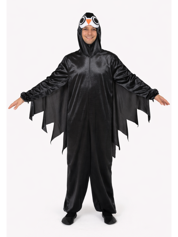 Başlık kısmında yer alan baykuş yüz detayı kostüme karakter kazandırır. Yan kısımlarda bulunan pelerin formundaki kanat tasarımı, kollar açıldığında dikkat çekici bir siluet oluşturur. Bu özel tasarım sayesinde sahnede, partide veya fotoğraf çekimlerinde güçlü bir görsel etki yaratır.