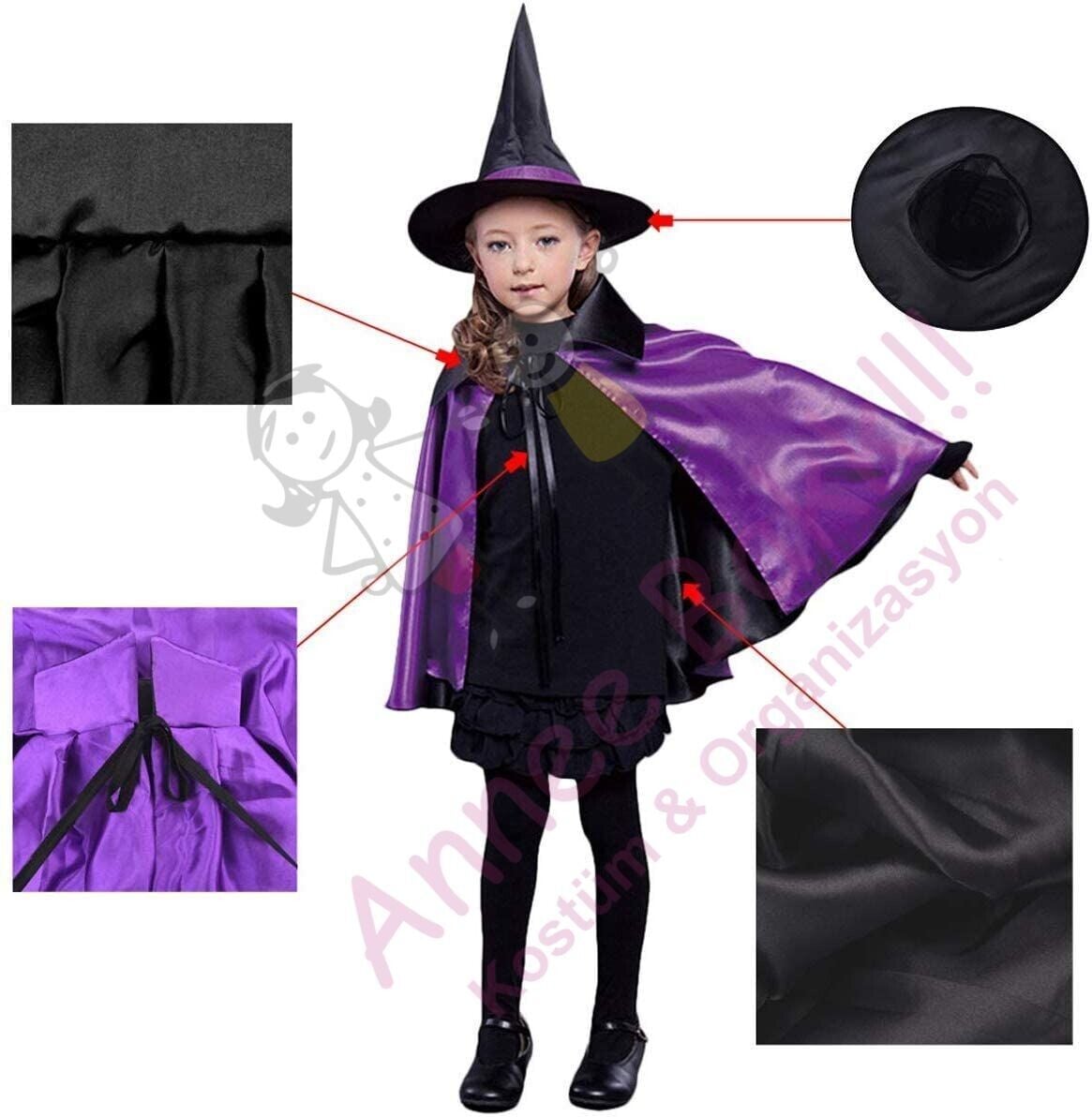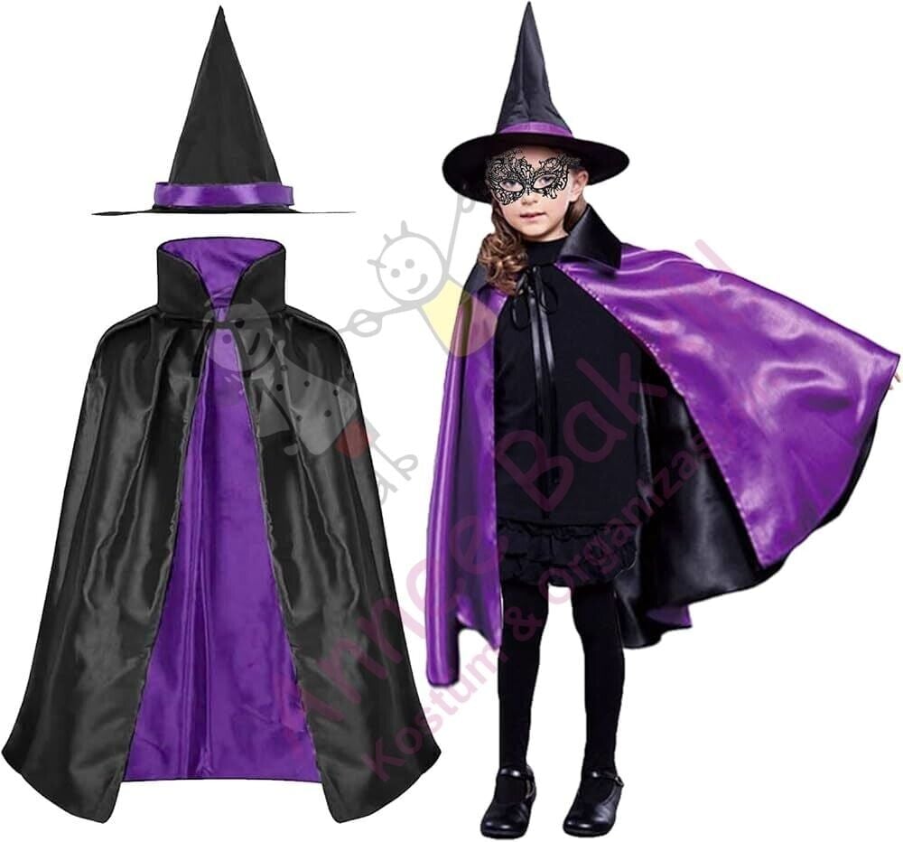 Çift Taraflı Cadı Pelerini ve Şapka Set, Cadılar Bayramı Çocuk Pelerin Şapka Set