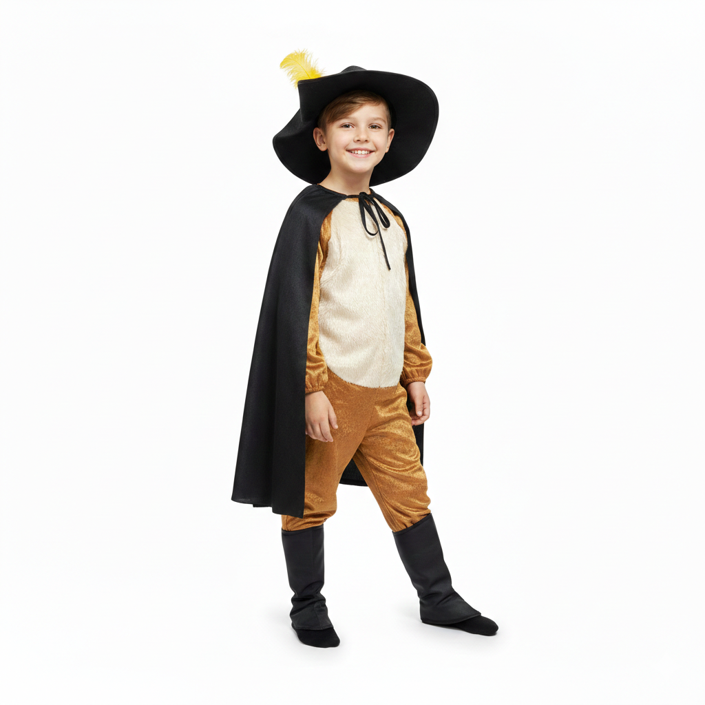 Çizmeli Kedi Çocuk Kostümü - Nubuk Kuyruklu Tulum, Kadife Pelerin ve Keçe Şapka