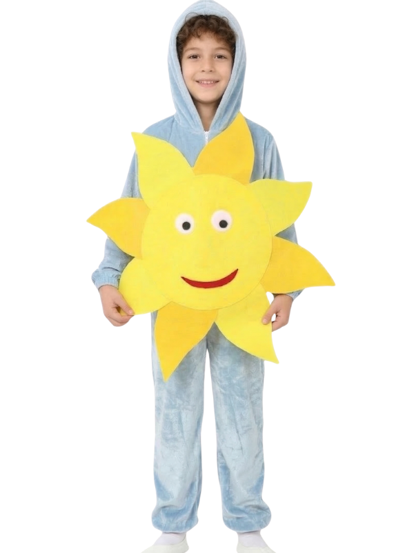 Kaliteli kadife ve keçe kumaşlarından üretilmiş olan Güneş Çocuk Kostümü, dayanıklı ve rahat bir giysi sunar. Çocukların uzun süre rahatça kullanabileceği bu kostüm, güneş temalı detaylarıyla dikkat çeker.