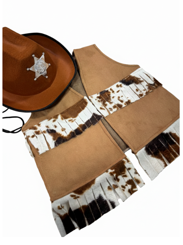 Çocuk Kovboy Yelek ve Şapka Seti, Unisex Püsküllü Kovboy Kostümü