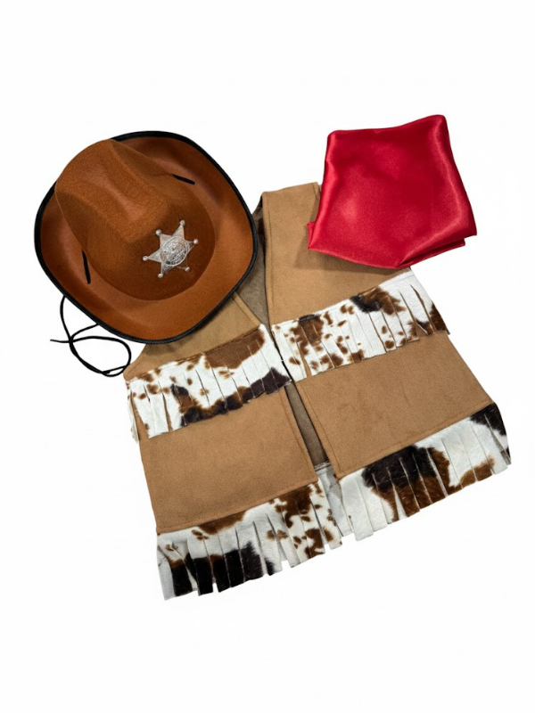 Kostüm seti; kovboy yeleği, kovboy şapkası ve fular olmak üzere 3 parçadan oluşur. Keçe, nubuk, saten ve baskılı kumaş kombinasyonu ile hazırlanmış bu set, çocuklara tam bir kovboy karakteri görünümü kazandırır. Ek aksesuara ihtiyaç duymadan bütünlüklü bir kostüm deneyimi sunar.