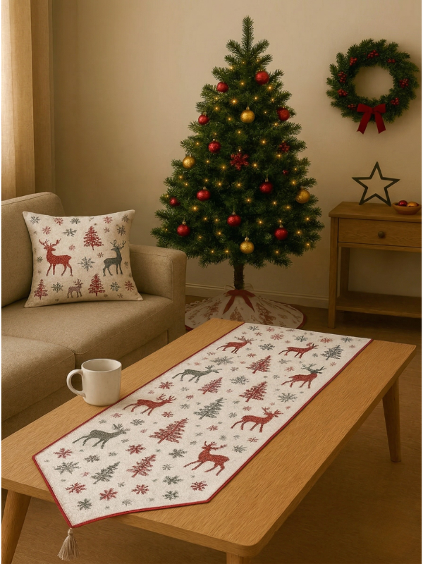 Sevdiklerinizle paylaştığınız unutulmaz akşam yemeklerini geyik desenli runner ile taçlandırın, ardından koltuğunuzdaki çam ağacı motifli yastık ile kahve keyfinizi tamamlayın. Standart ölçülere sahip yapısı sayesinde her mobilyaya kolayca uyum sağlayan bu set, aynı zamanda sevdikleriniz için harika bir yeni yıl hediye seçeneğidir. Evinize hem sıcaklık hem de modern bir dokunuş katmak için bu özel seriyi hemen keşfedin!