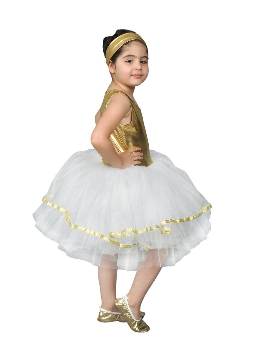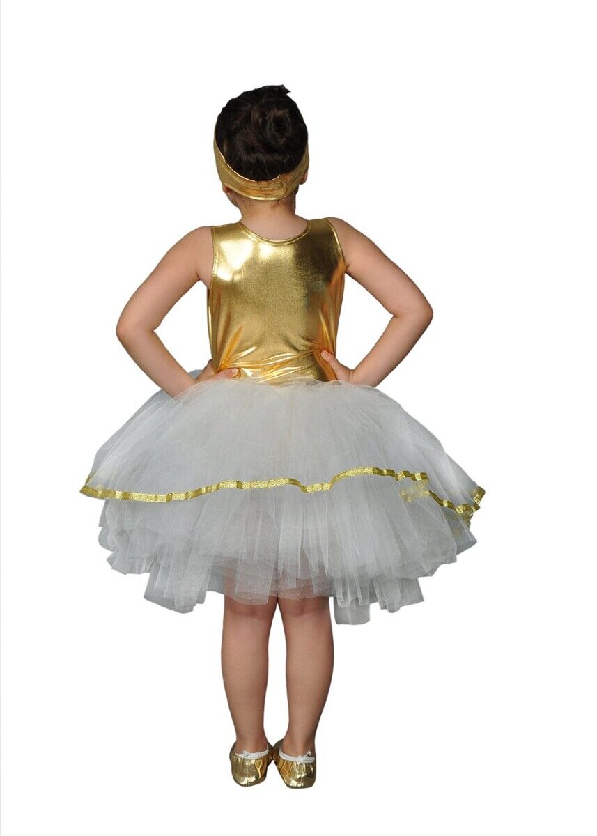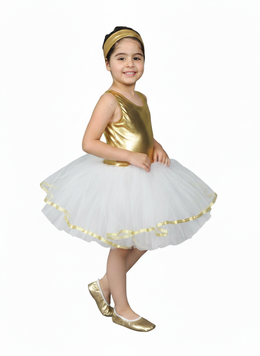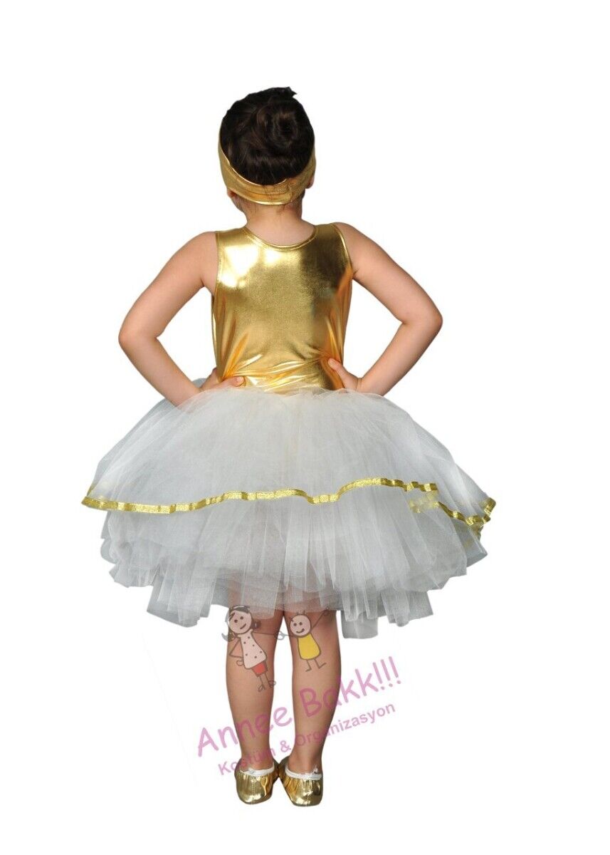 Gold ve beyaz renk tütü elbise, kostüm partilerinde, okul gösterilerinde, 23 Nisan şenliklerinde ve daha birçok farklı etkinlikte kullanılabilir. Minik prensesler bu özel tasarım ile her ortamda göz kamaştıracak.