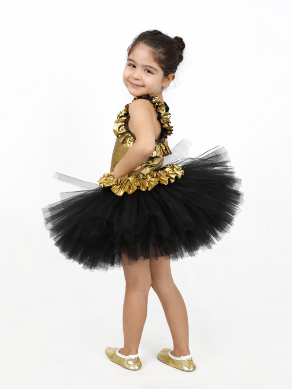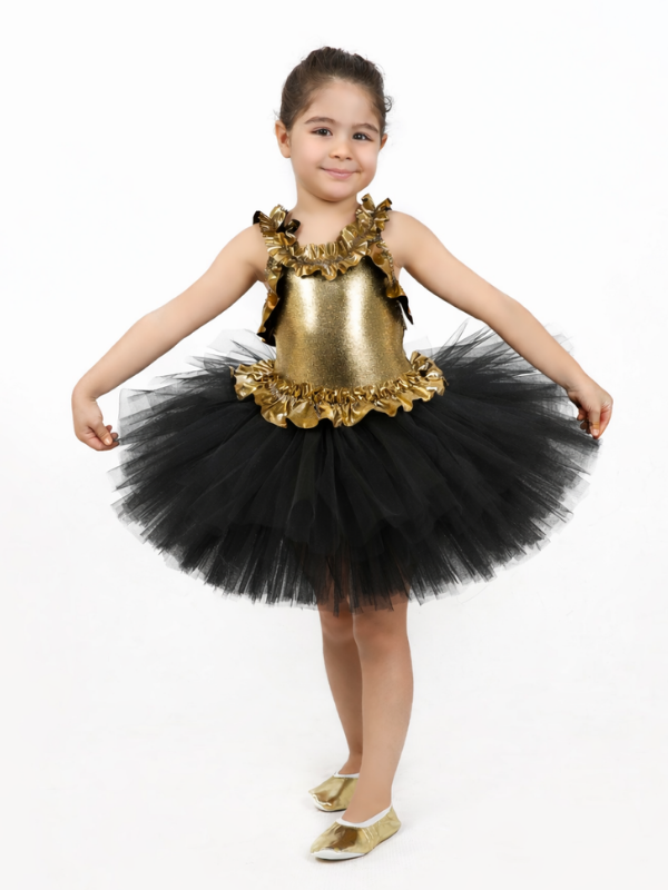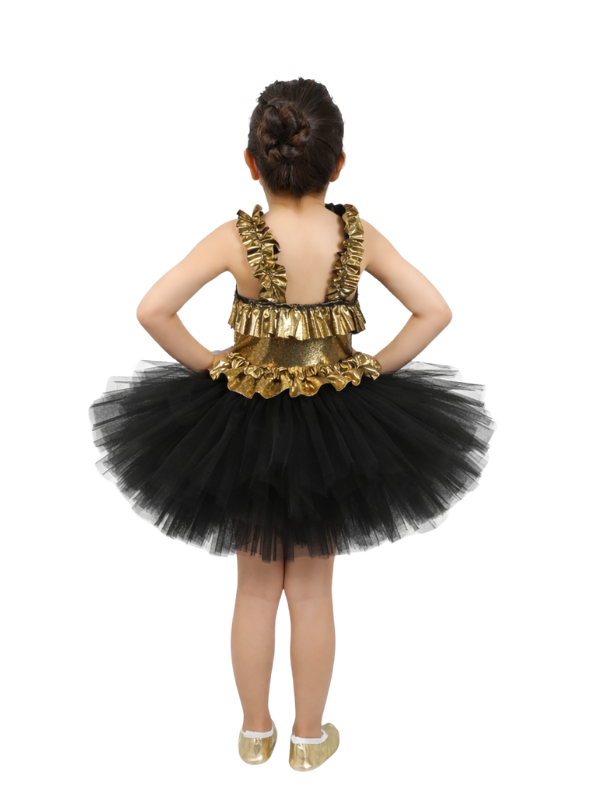 Gold renk bale kostümü, likralı gold kumaş ve kristal tülün bir araya gelmesiyle minik prenseslere zarif ve asil bir görünüm sunuyor. Siyah etek ve gold bluzdan oluşan bu özel tasarım, her ortamda dikkat çekici bir görünüm sağlıyor.