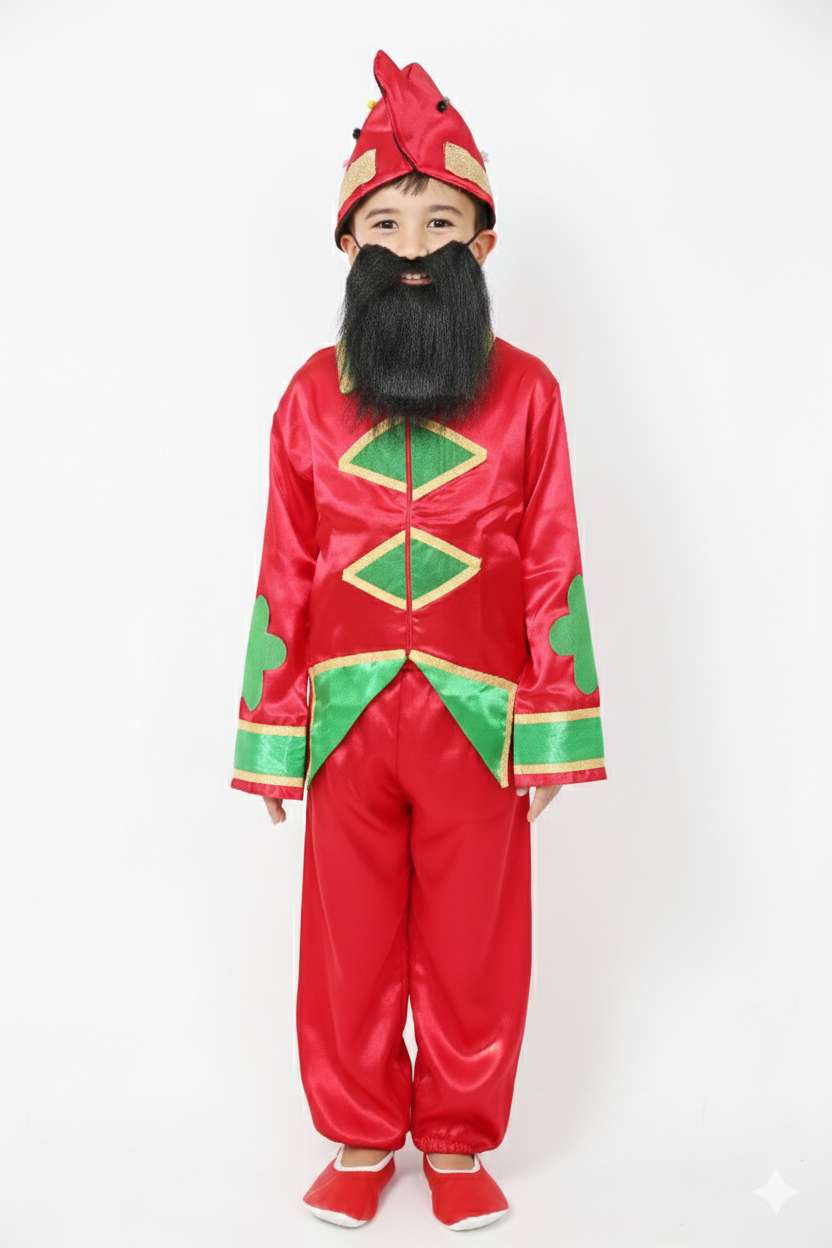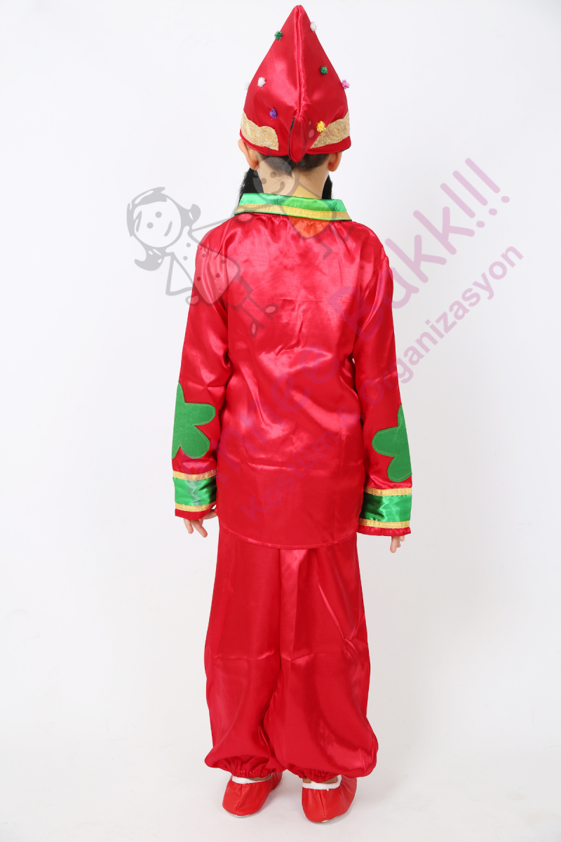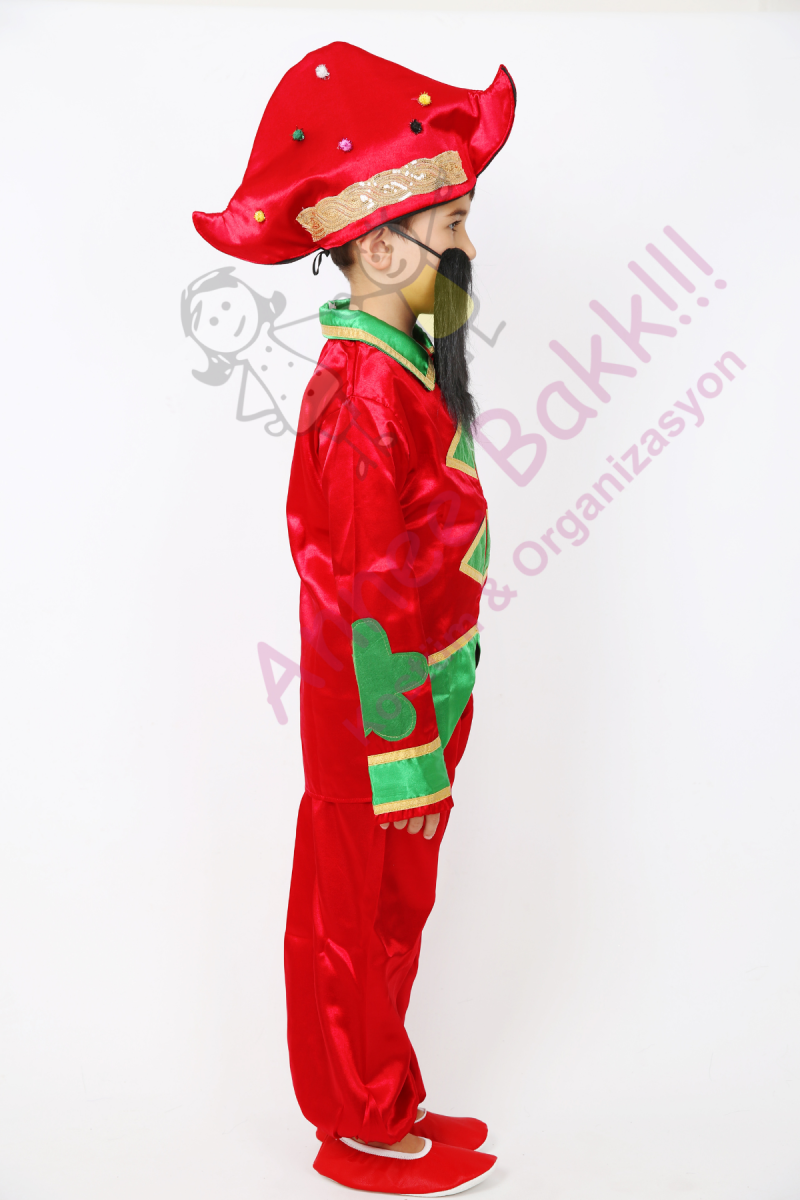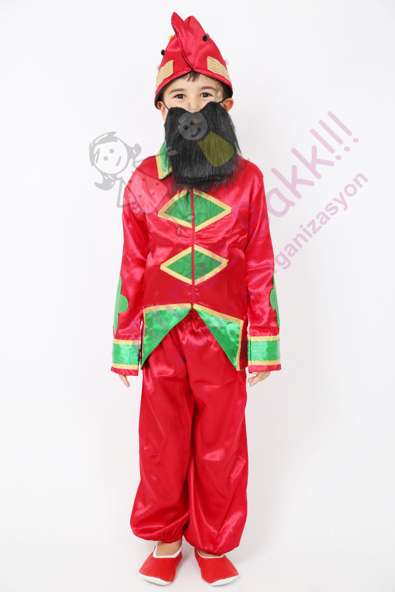 Karagöz kostümü, kırmızı ve yeşil renk detaylarıyla dikkat çeker. Her bir parça, özgün tasarımıyla çocukların dikkatini çekerken, aynı zamanda kaliteli kumaşıyla konforlu bir kullanım sunar.