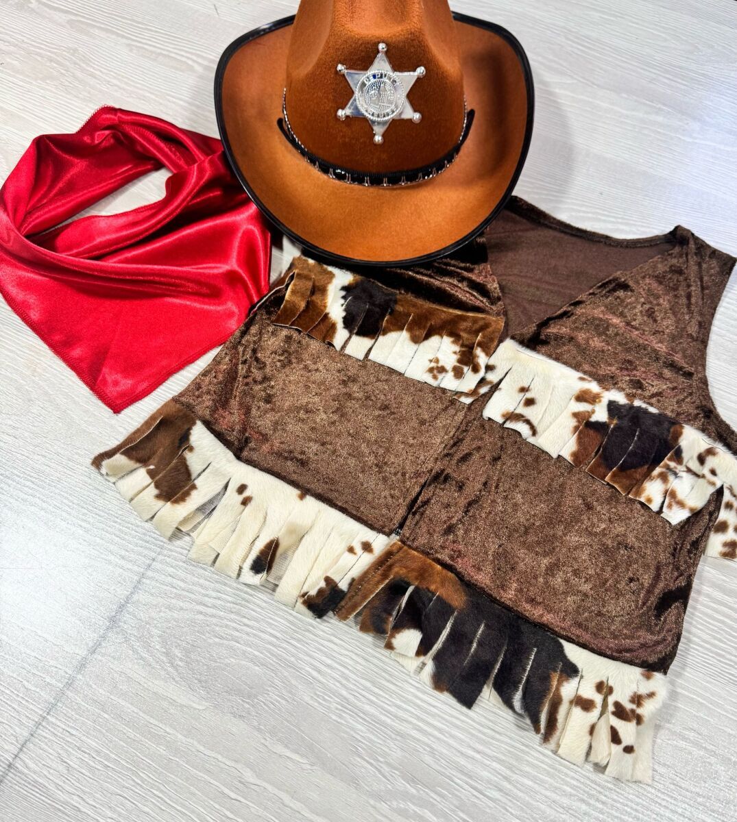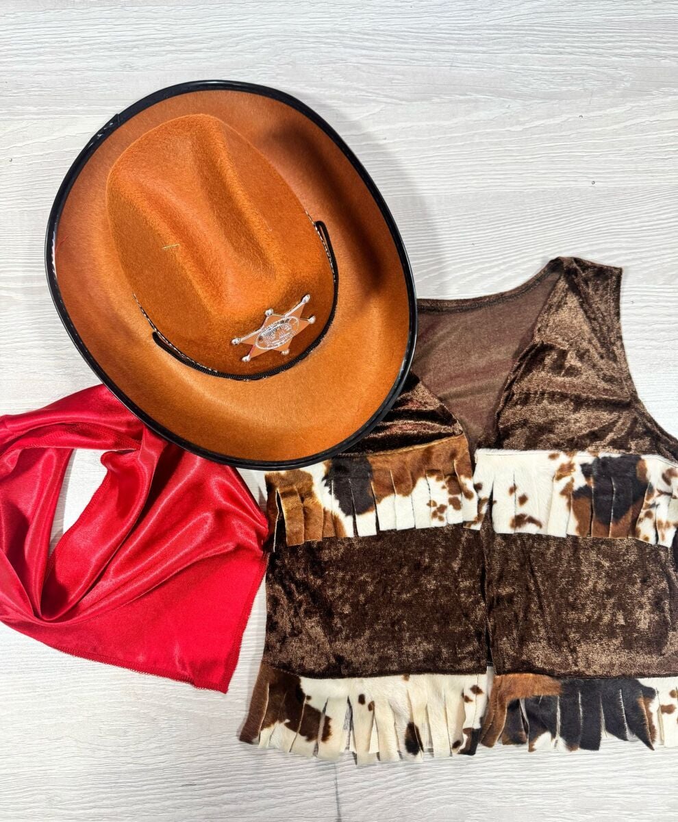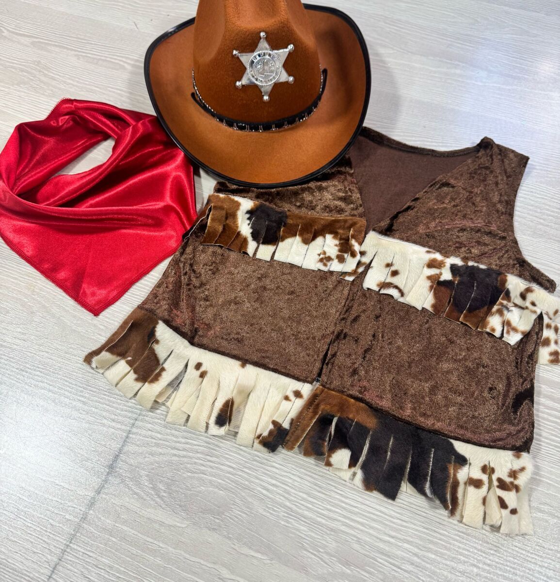 Kovboy temalı partiler, tiyatro gösterileri ve doğum günü etkinlikleri için tasarlanmış Kovboy Çocuk Aksesuar Seti, küçük kovboylara özgü bir tarz sunar. Bu özel set, kovboy şapkası, püsküllü kovboy yeleği ve fular gibi detaylarla tamamlanmıştır. Kadife ve saten kumaştan üretilen bu ürün, hem şıklığı hem de rahatlığı bir arada sunar.