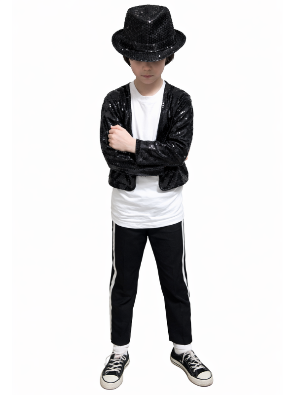 Simli şeritli pantolon, pullu ceket, tişört ve şapka gibi detaylarla donatılmış olan kostüm, Michael Jackson'un unutulmaz tarzını yansıtır. Bu özel tasarım detaylarıyla çocuklarınızın dikkatini çekecek ve onları büyülü bir dünyaya götürecek.