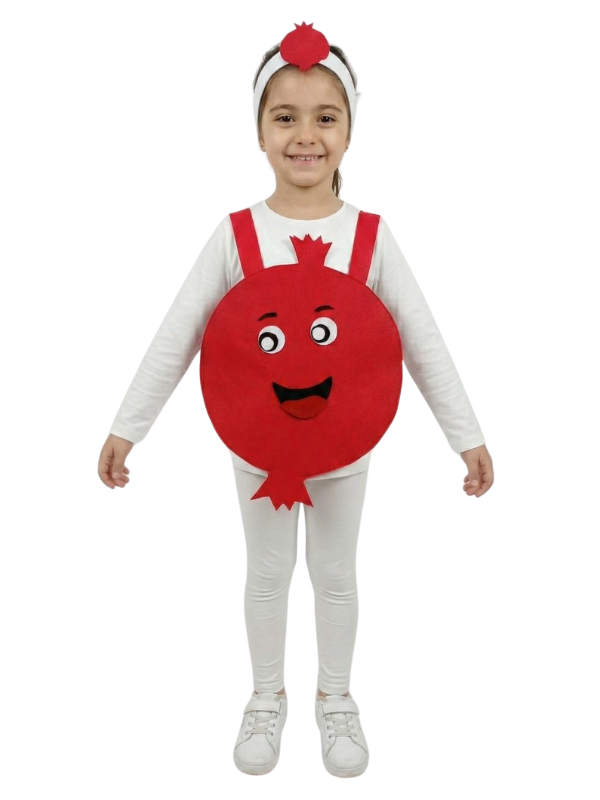 Kaliteli ve yumuşak keçe dokusuyla hazırlanan bu set; nar formundaki gövde önlüğü ve meyvenin tacını simgeleyen saç bandından oluşur. Nar meyve kostümü, dayanıklı yapısıyla tüm okul dönemi boyunca farklı etkinliklerde ve temalı partilerde tekrar tekrar kullanılabilir.