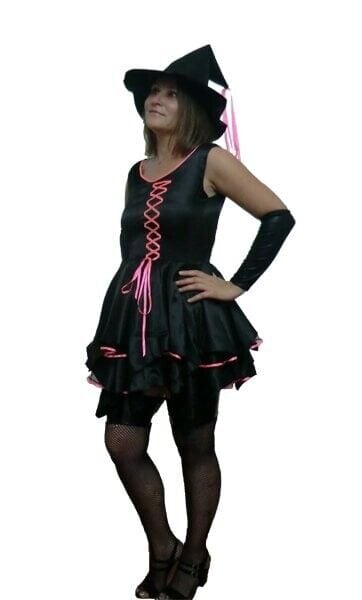 Bu özel kostüm, cadı elbisesi, bir çift kolluk aksesuarı ve cadı şapkasından oluşmaktadır. Pembe kurdele detayı, kostüme zarif bir dokunuş katarken, geleneksel cadı temasını modern bir şekilde yorumlar. Hem klasik hem de modern unsurları bir araya getiren bu tasarım, her ortamda dikkatleri üzerinize çekecek. Özellikle Cadılar Bayramı'nda göz alıcı olmak isteyen kadınlar için ideal bir seçimdir.