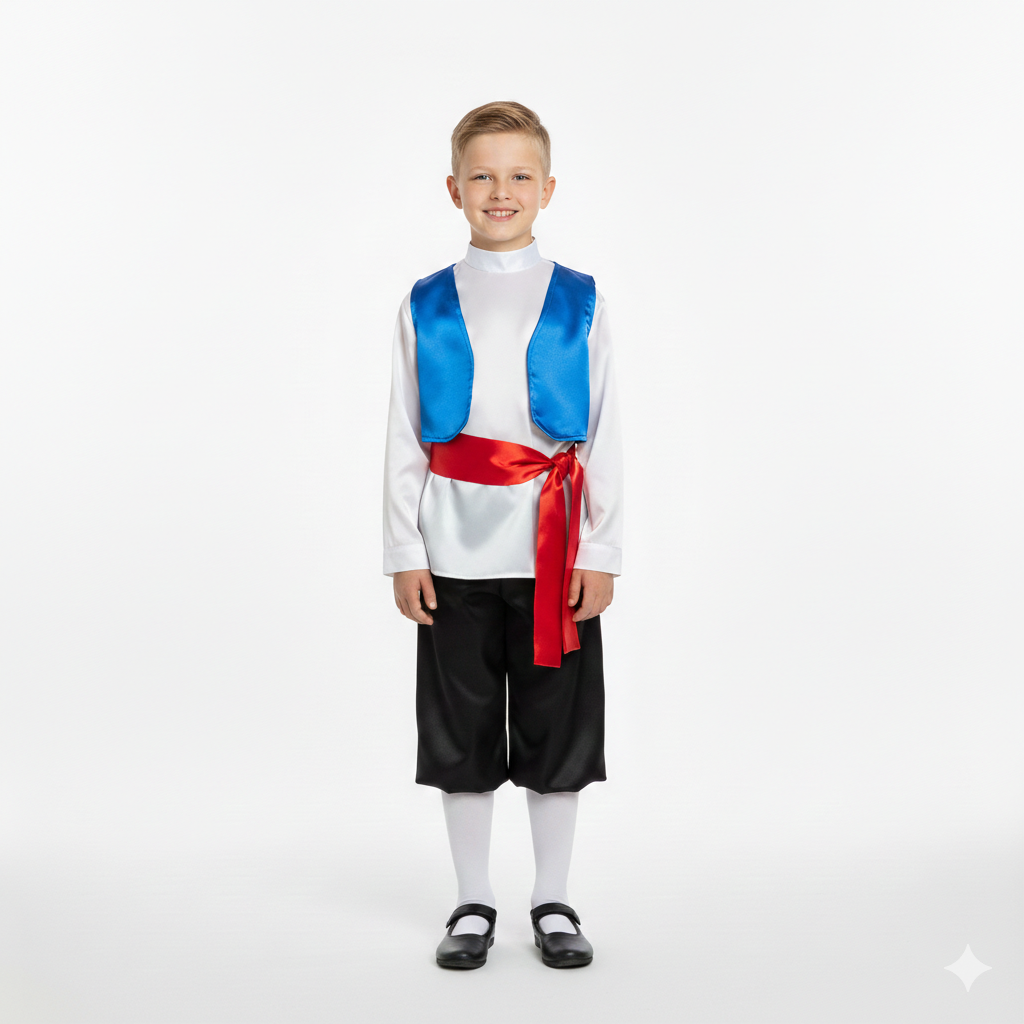 Polonya erkek çocuk kostümü; saten kumaştan üretilmiş beli lastikli şort, gömlek, yelek ve kuşaktan oluşan 4 parçalı özel bir settir. Ülke temalı çocuk kostümü arayan ebeveynler ve öğretmenler için hem görsel olarak dikkat çekici hem de kullanışlı bir modeldir. Saten kumaşın parlak yapısı sahne performanslarında net bir görünüm sağlar.