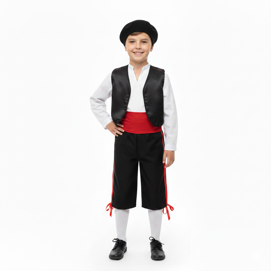 Portekiz erkek çocuk kostümü; saten ve poplin kumaştan üretilmiş pantolon, gömlek, yelek, şapka ve bel kuşağından oluşan 5 parçalı özel bir settir. Ülke temalı çocuk kostümü arayan ebeveynler ve öğretmenler için hem görsel olarak güçlü hem de kullanışlı bir alternatiftir. Sahne üzerinde kültürel temayı net şekilde yansıtan tasarımı ile dikkat çeker.