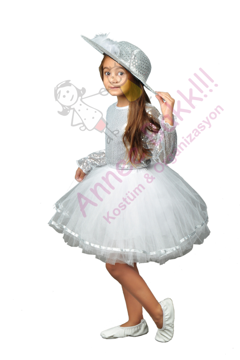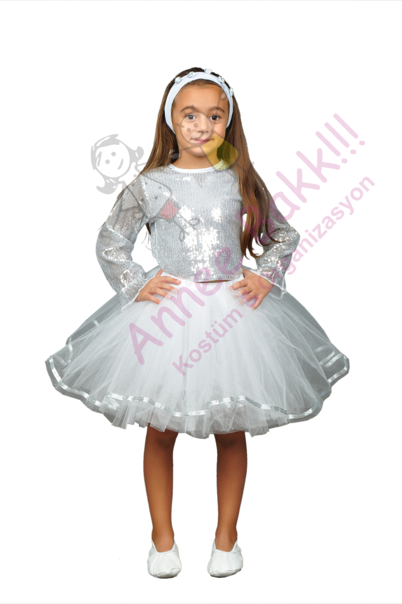 Silver-gümüş renk tütü dans kostümü, kostüm partilerinde, okul gösterilerinde, 23 Nisan şenliklerinde ve daha birçok farklı etkinlikte kullanılabilir. Minik dansçılar bu özel tasarım ile her ortamda göz kamaştıracak.