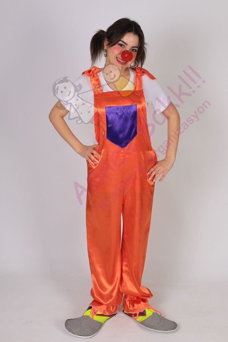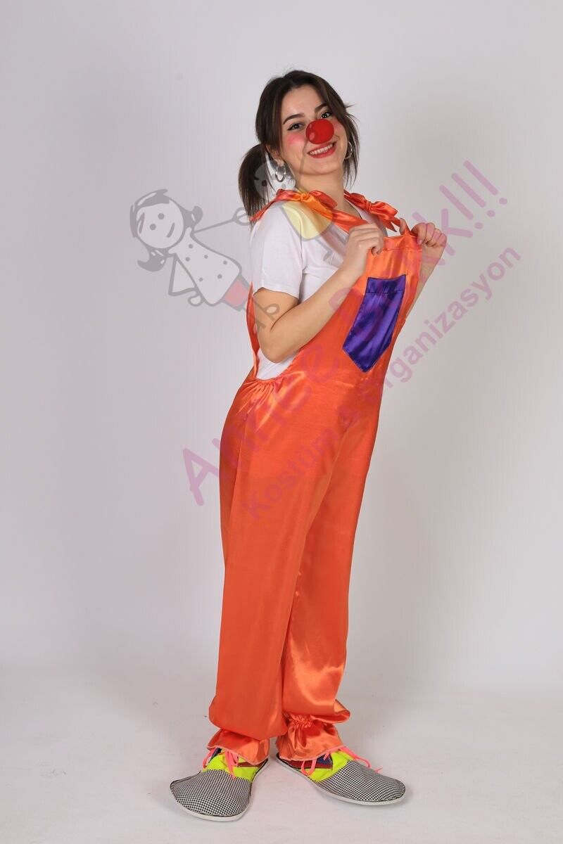 Turuncu Salopet Palyaço Kostümü, Yetişkinler İçin Askılı Palyaço Kıyafeti