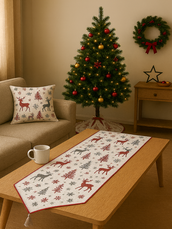 Yeni yıl ruhunu sofranıza taşıyacak özel tasarım yılbaşı temalı masa runner, hem şık hem de dikkat çekici detaylarıyla yılbaşı sofralarınızın vazgeçilmezi olacak. Yumuşak dokulu alpaka kumaş üzerine uygulanan geyik, kar tanesi ve çam ağacı desenleri; modern, sıcak ve zarif bir görünüm sunar.