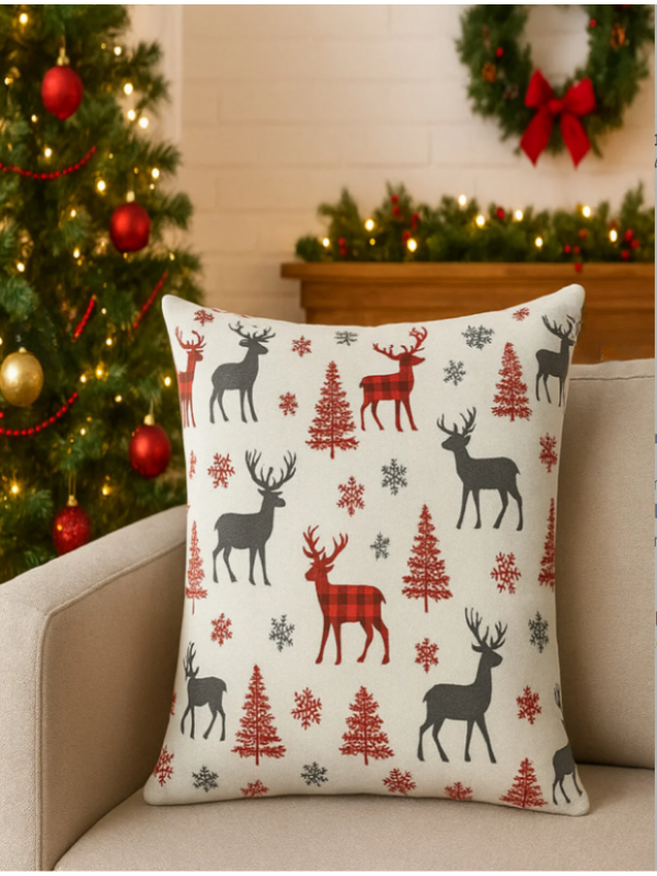 Kırmızı ve gri tonlarındaki geyik, çam ağacı ve kar tanesi motifleriyle hazırlanan bu yılbaşı yastık kılıfı; salon, oturma odası, pencere önü, şömine kenarı gibi her köşeye sıcak bir atmosfer katar. Yumuşak dokulu alpaka kumaşı sayesinde hem şık hem de dayanıklı bir kullanım sunar. Ürün 2 adet gönderilmektedir.